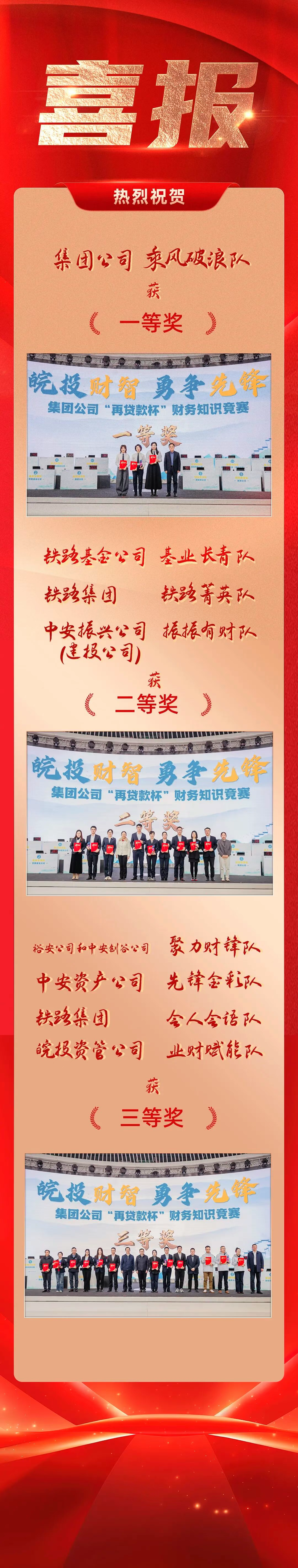 競賽啟動以來,得到了集團總部及各二級管理公司的積極響應,最終組成了 15 支代表隊參賽。比賽現場設置團隊必答、限時搶答、風險挑戰(zhàn)等五大環(huán)節(jié),經過2小時的激烈角逐,集團公司榮獲一等獎,鐵路基金公司、鐵路集團第一代表隊、中安振興公司(建投公司)代表隊榮獲二等獎,裕安公司和中安創(chuàng)谷聯(lián)合代表隊、中安資產公司、鐵路集團第二代表隊、皖投資管公司榮獲三等獎。